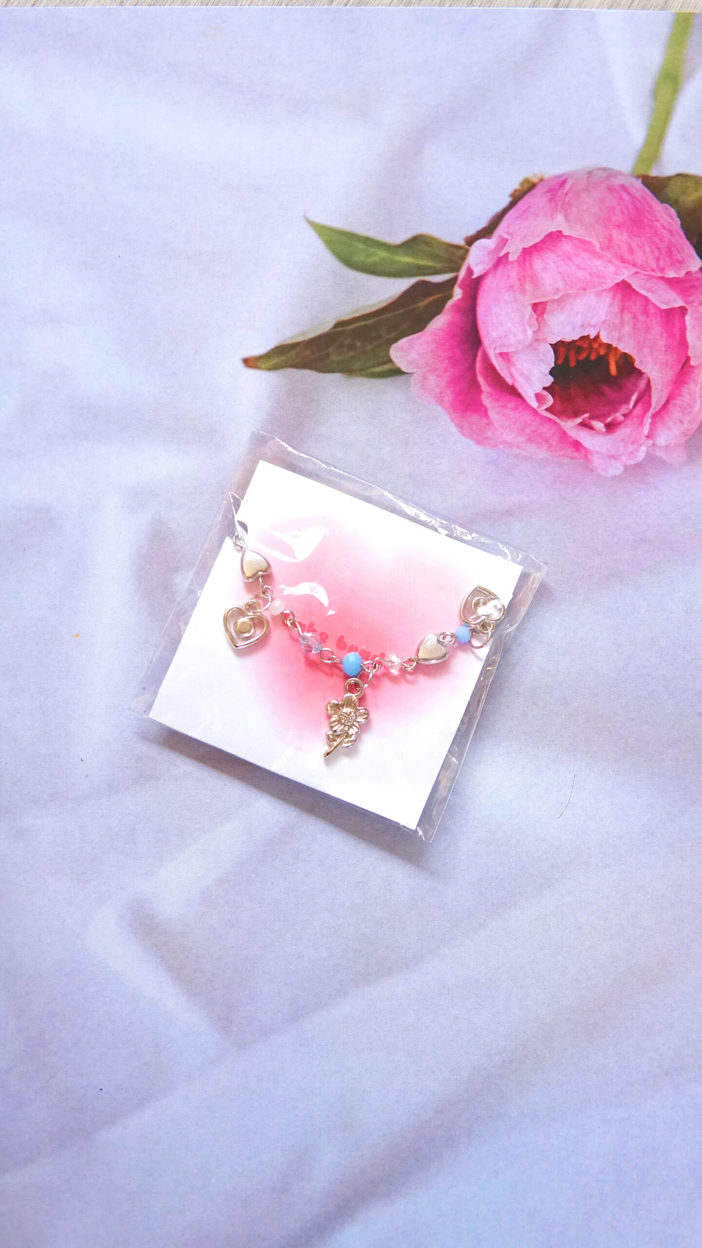 Setiap gelang dibuat dengan penuh perhatian, memadukan manik-manik berwarna lembut dan liontin metalik yang menawan. Liontin berbentuk hati dan bunga mawar menambah kesan romantis, sementara manik-manik biru kecil memberikan pop of color yang cerah. Desainnya yang minimalis membuatnya cocok untuk dipakai sehari-hari, baik sendiri maupun ditumpuk bersama gelang lain.
