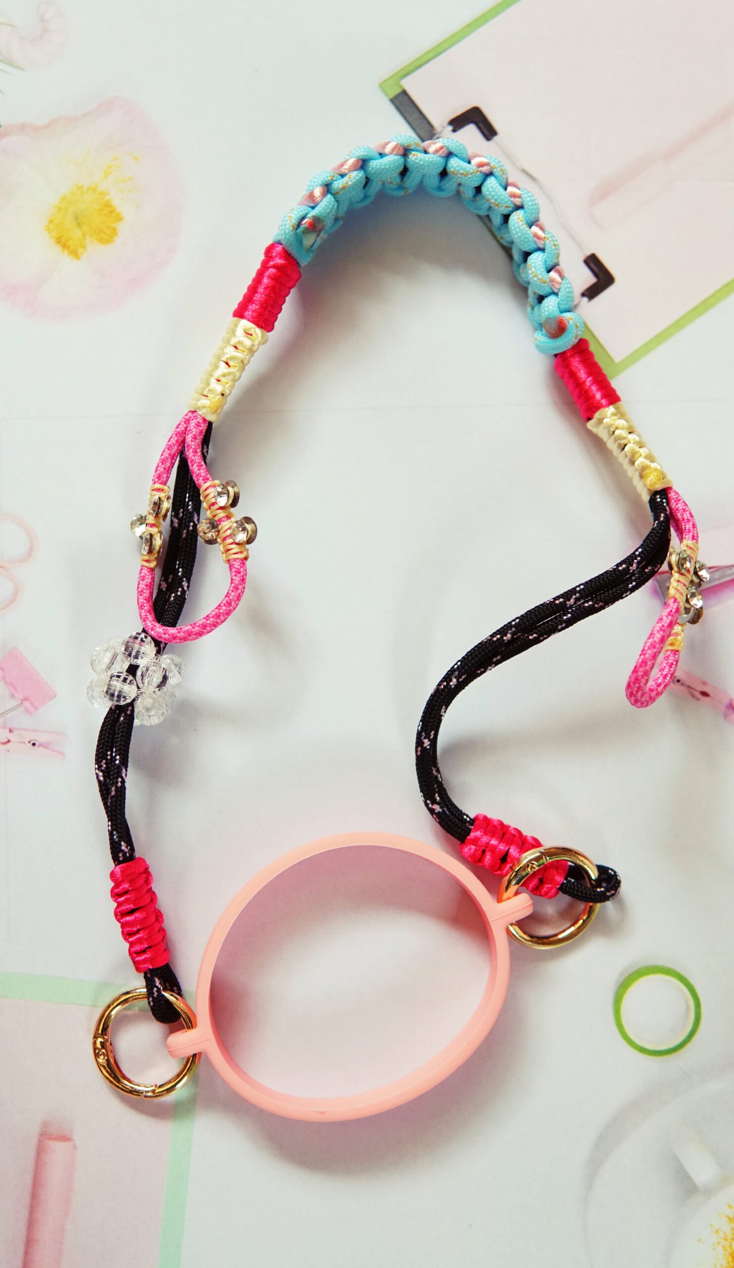 Dibuat secara handcrafted dengan perpaduan warna yang ceria dan material yang kuat, strap ini akan menjadi teman setia Anda. Desainnya yang eklektik memadukan tali rajut biru, tali pink neon, dan tali hitam yang kokoh, dilengkapi hiasan manik-manik bening yang memberikan sentuhan sparkle. Ring metalik berwarna emas menambah kesan mewah, sementara ring silikon berwarna pink berfungsi sebagai pengikat yang fleksibel dan aman untuk botol Anda.
